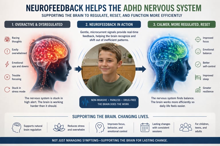 Using gentle, non-invasive microcurrent neurofeedback, we support the brain’s natural ability to regulate—so focus, behavior, and emotional responses can begin to improve.