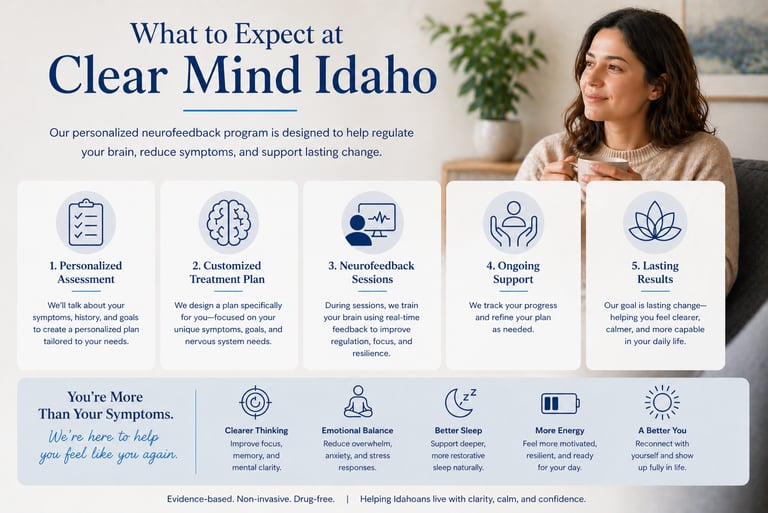 While Clear Mind Idaho does not diagnose or treat depression, many people seek neurofeedback as part of a broader plan to support emotional regulation, stress resilience, sleep, and nervous system balance.