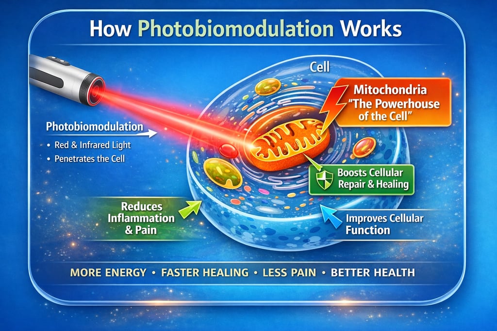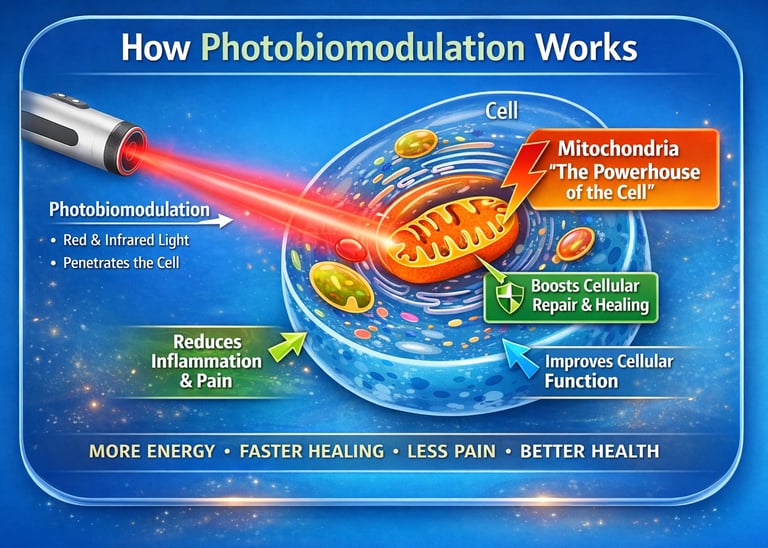 Photobiomodulation uses specific wavelengths of red and near-infrared light to support healthy brain cell function. When this light penetrates the scalp and underlying tissue, it is absorbed by the mitochondria within brain cells. Mitochondria are responsible for producing ATP, the energy that cells need to function, repair, and communicate.