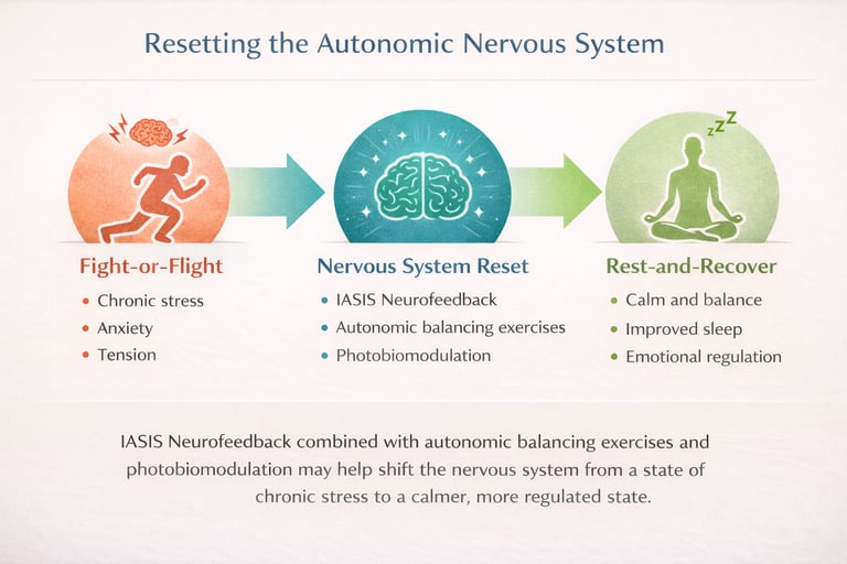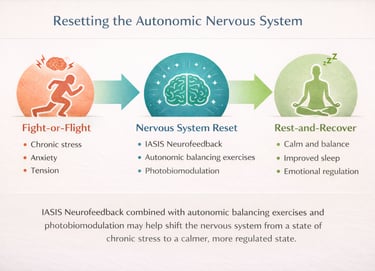 By engaging specific nerve pathways while the brain is receiving IASIS Neurofeedback, the nervous system is encouraged to shift out of chronic fight-or-flight patterns and move toward a more balanced and regulated state.
